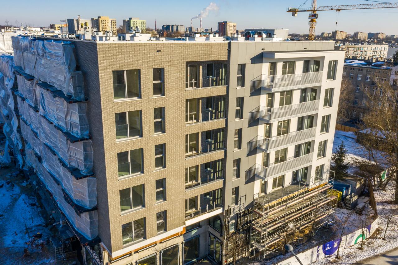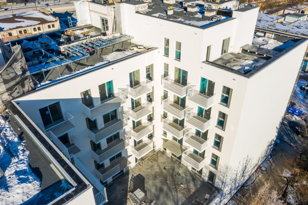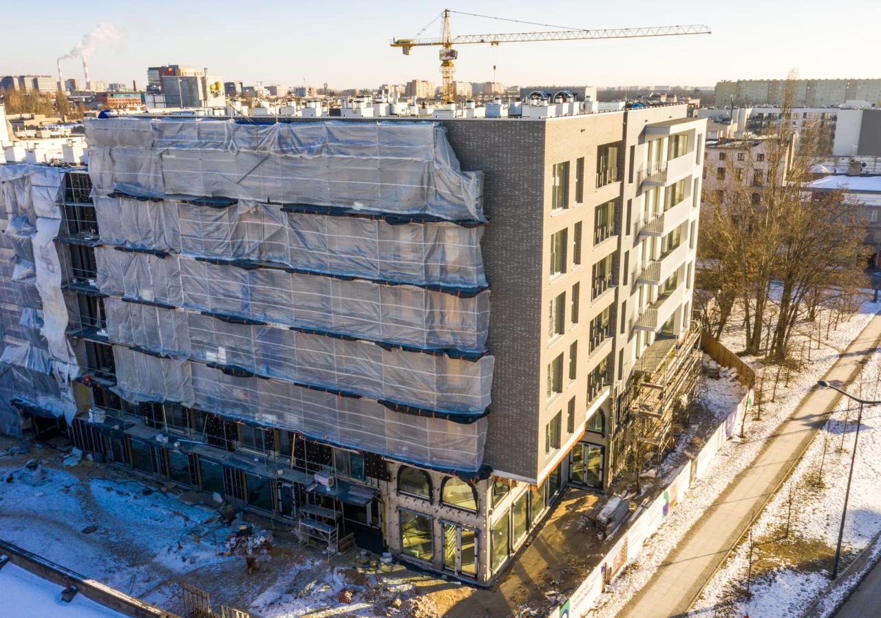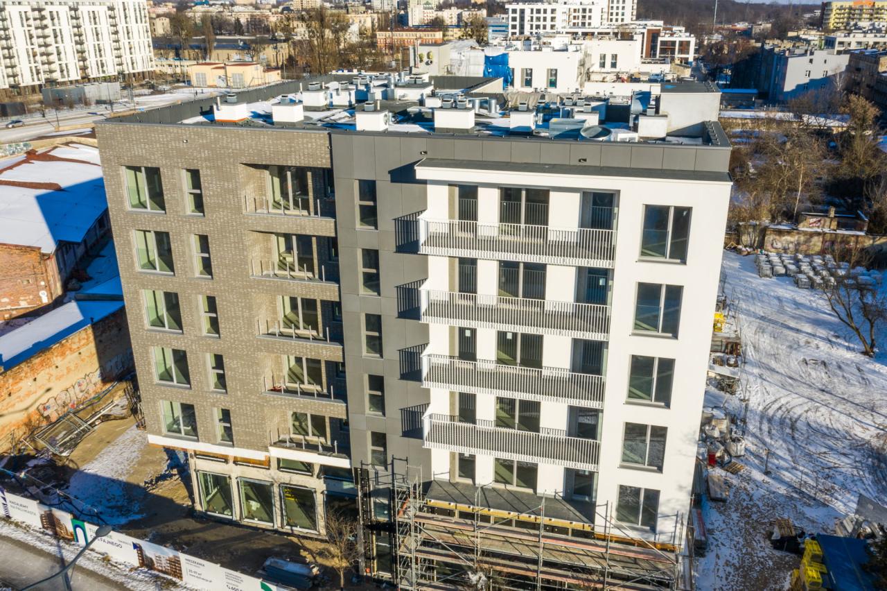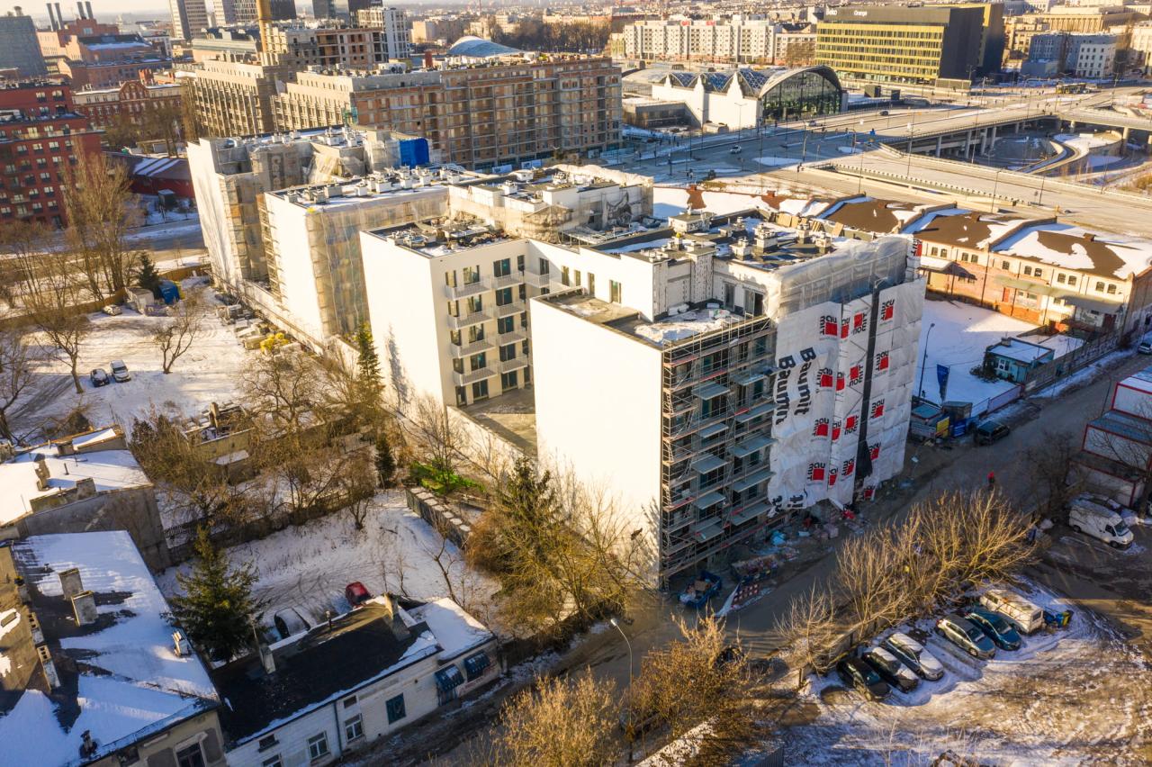 Każdy, kto przechodzi ulicą Wodną, może zobaczyć, że prace nad elewacją idą pełną parą! Kontynuujemy też roboty dachowe i instalacyjne, montujemy stolarkę okienną i posadzki, a także piony kanalizacji.